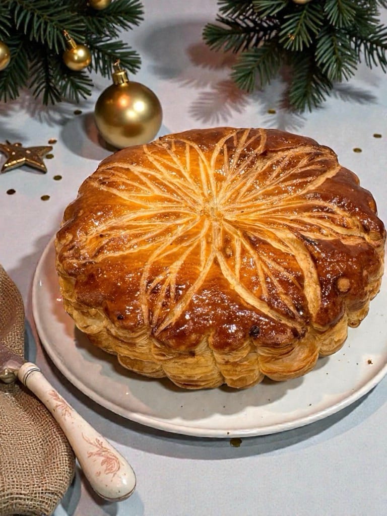 La galette des rois aux pommes -cassis se compose d’une pâte feuilletée dorée garnie d’une généreuse compotée de pommes râpées cuisinées au sucre cassonade et rhum, celle-ci parsemée de cassis sur une fine couche de crème d’amandes, avec la collection fève « Art Lux »